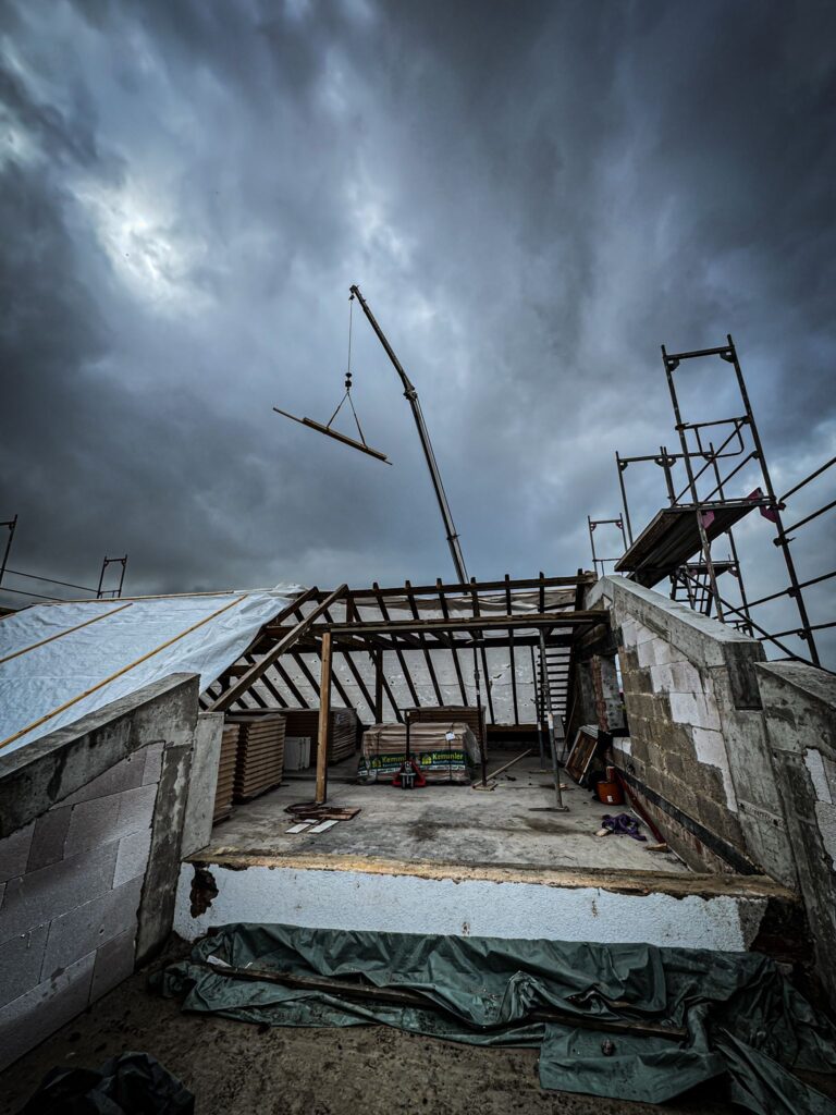 Nach dem sorgfältigen Abriss des alten Dachaufbaus folgte die Ausführung der neuen Erweiterung, die im Dachgeschoss zusätzlichen Wohnraum sowie Stauraum schafft und das Gebäude funktional deutlich aufwertet.