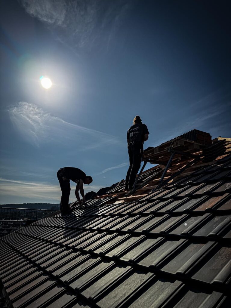 Gegen Ende des Projekts folgten die finalen Arbeiten: Die neuen Dachfenster wurden eingesetzt, die Blecharbeiten fachgerecht ausgeführt und schließlich die neuen, hochwertigen Dachziegel verlegt.