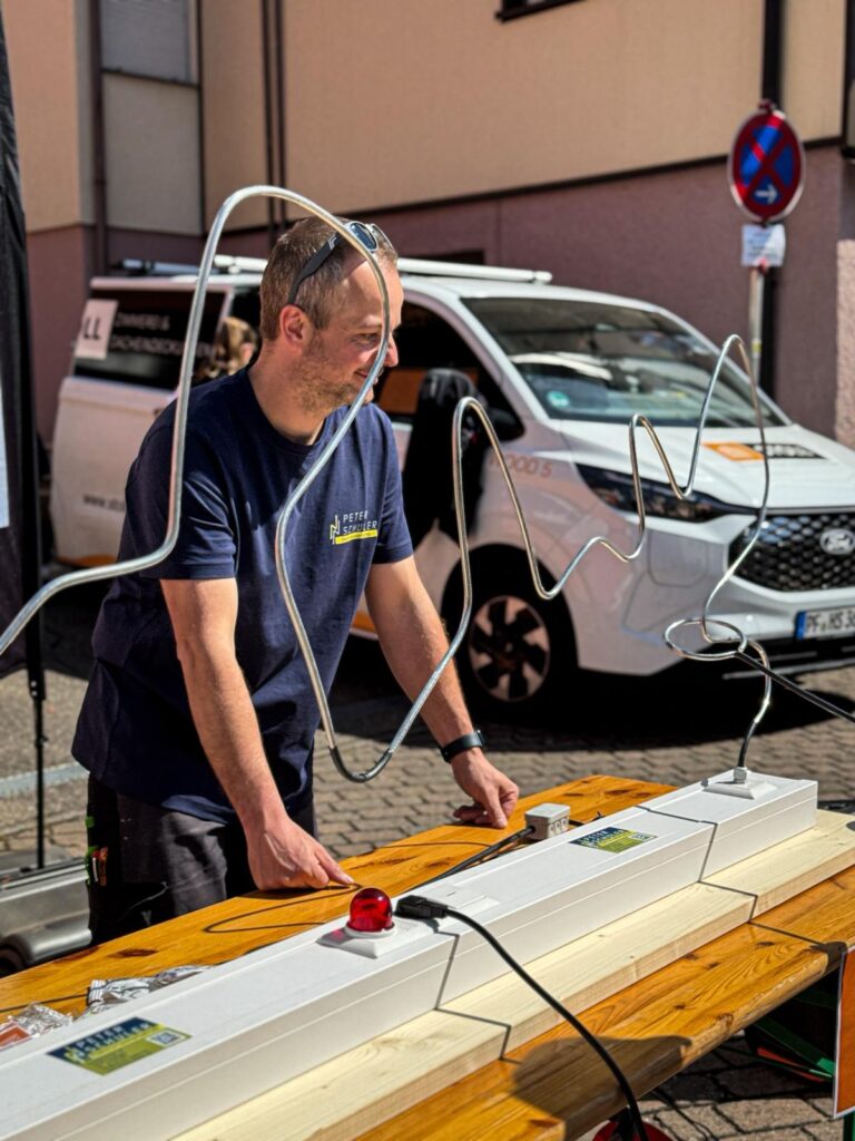 Natürlich kam auch der Spaß nicht zu kurz: Von der beliebten Kran-Aktion bis hin zu verschiedenen Mitmach-Stationen war einiges geboten. Gemeinsam mit dem Elektromeisterbetrieb Schuler, mit dem wir auch regelmäßig auf unseren Baustellen zusammenarbeiten – beispielsweise bei der Umsetzung von Solaranlagen auf unseren Dächern – haben wir den „heißen Draht“ angeboten. Eine Herausforderung für ruhige Hände und starke Nerven.